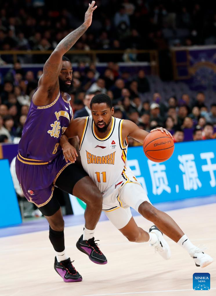 Kahlil Felder (L) of Beijing Royal Fighters vies with Isaiah Taylor of Shanxi Loongs during the 7th round match between Beijing Royal Fighters and Shanxi Loongs at 2023-2024 season of the Chinese Basketball Association (CBA) league in Beijing, capital of China, Nov. 6, 2023. (Xinhua/Luo Yuan)