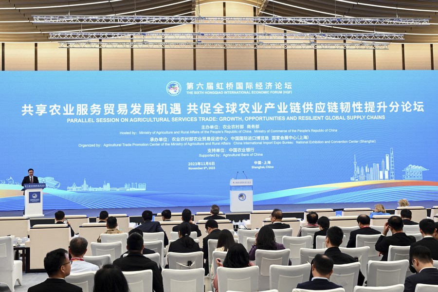 The parallel session on Agricultural Service Trade: Growth, Opportunities and Resilient Global Supply Chains of the sixth Hongqiao International Economic Forum is held in Shanghai, east China, Nov. 6, 2023. (Xinhua/Jin Liangkuai)