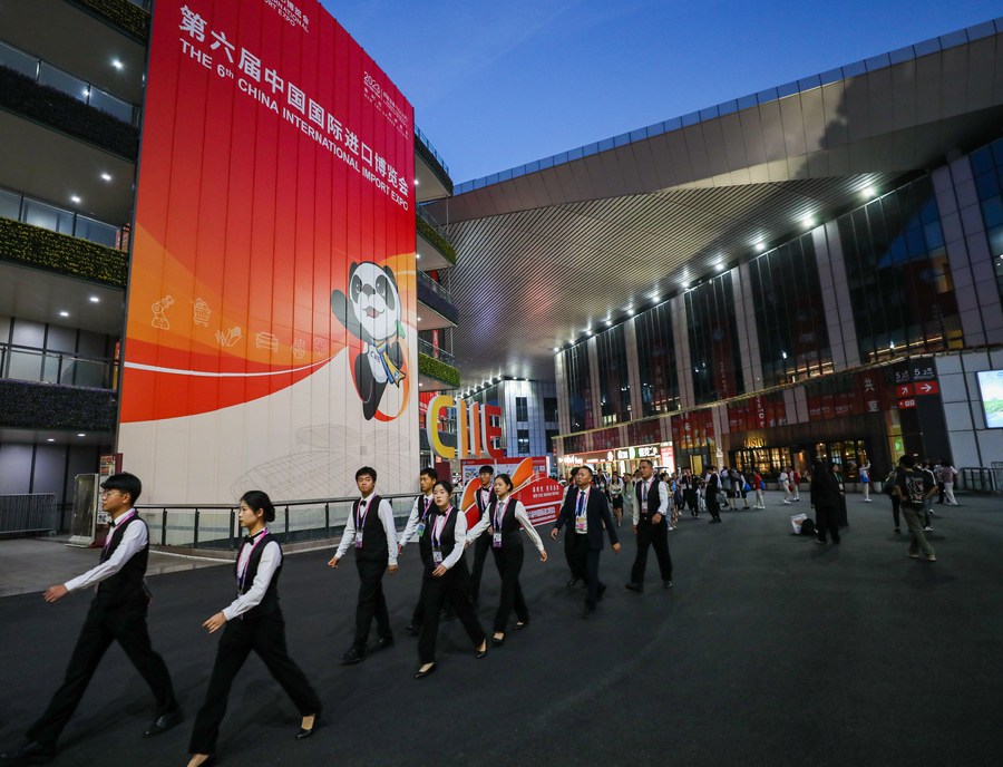 Staff members walk past a giant poster of the 6th China International Import Expo (CIIE) in east China's Shanghai, Nov. 5, 2023. (Xinhua/Xin Mengchen)