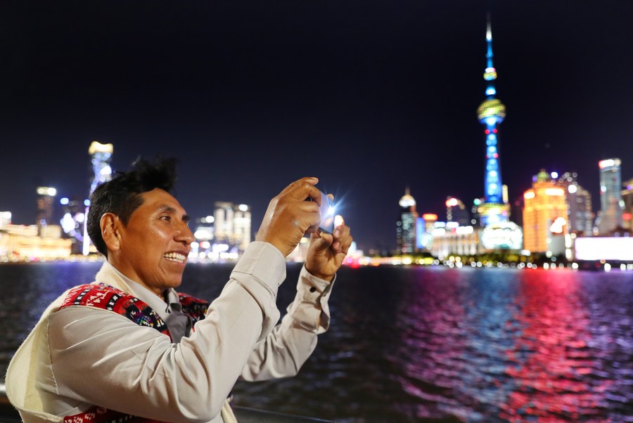 Peruvian craftsman Mamani takes photos at the Bund in east China's Shanghai, Nov. 2, 2023. (Xinhua/Fang Zhe)