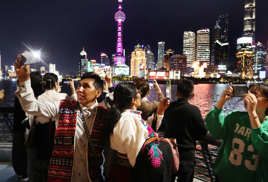 Peruvian craftsmen Mamani and his wife Gloria visit the Bund in east China's Shanghai, Nov. 2, 2023. (Xinhua/Fang Zhe)