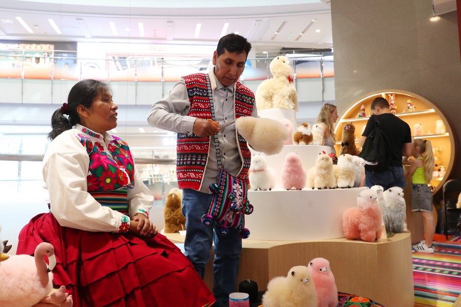Peruvian craftsmen Mamani and his wife Gloria demonstrate the making of alpaca-fur stuffed toys at a shop of Warmpaca in east China's Shanghai, Nov. 2, 2023. (Xinhua/Fang Zhe)