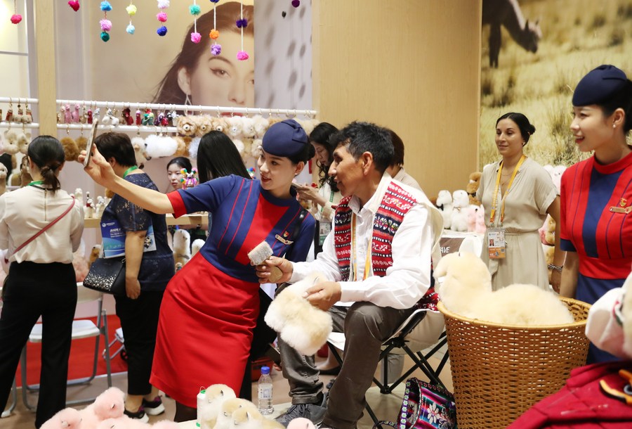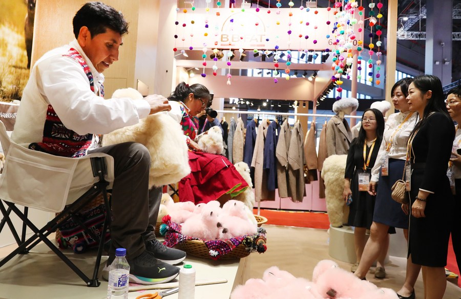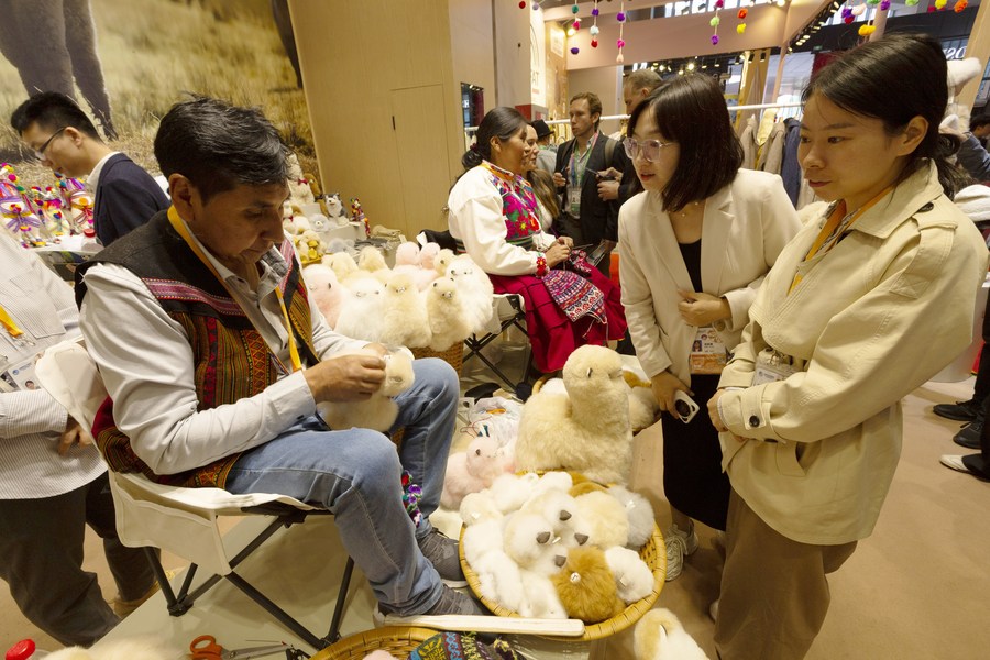 Peruvian craftsman Mamani makes alpaca-fur stuffed toys at the booth of Warmpaca during the 6th China International Import Expo (CIIE) in east China's Shanghai, Nov. 7, 2023. (Xinhua/Gao Wei)