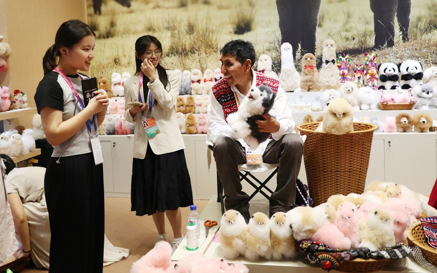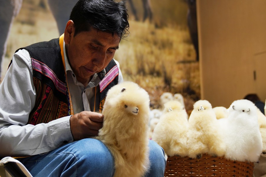 Peruvian craftsman Mamani displays alpaca-fur stuffed toys at the booth of Warmpaca during the 6th China International Import Expo (CIIE) in east China's Shanghai, Nov. 7, 2023. (Xinhua/Li Mengjiao)
