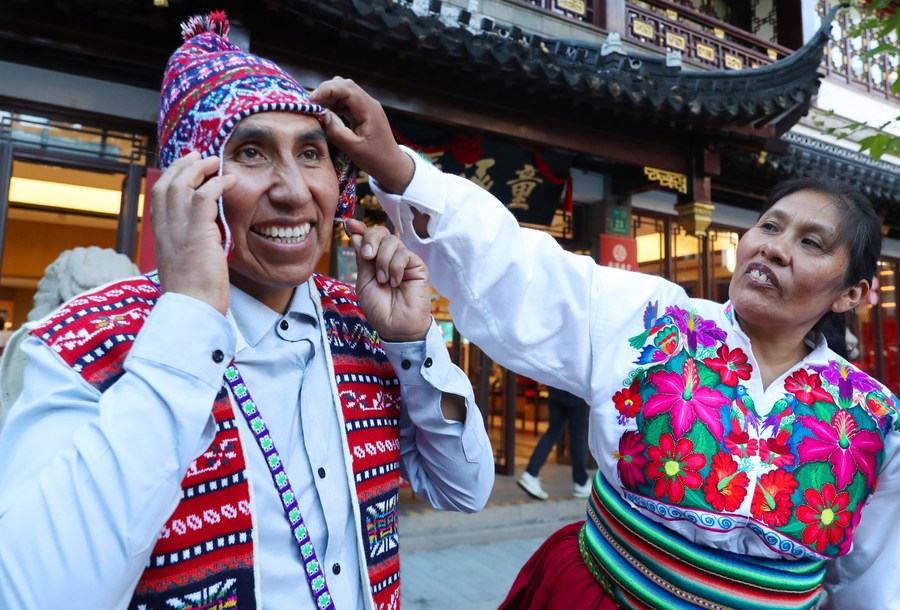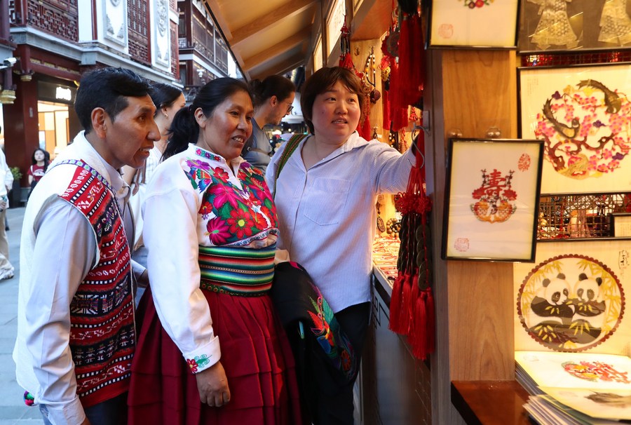 Ma Yuxia (R) introduces traditional Chinese handicrafts to Peruvian craftsmen Mamani and his wife Gloria at Yuyuan Garden in east China's Shanghai, Nov. 2, 2023. (Xinhua/Fang Zhe)