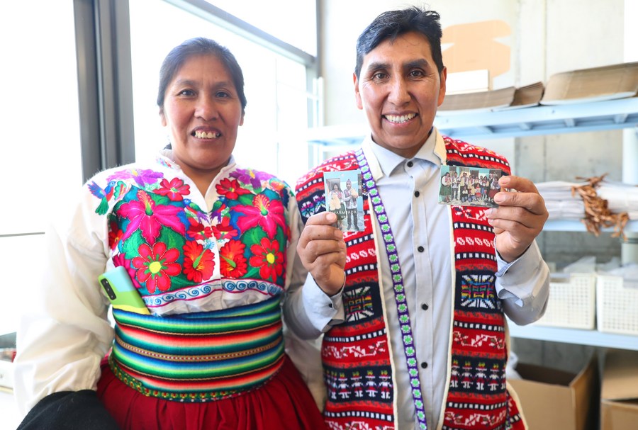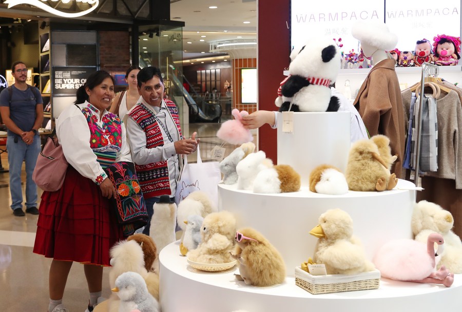 Peruvian craftsmen Mamani and his wife Gloria visit a shop of Warmpaca in east China's Shanghai, Nov. 2, 2023. (Xinhua/Fang Zhe)