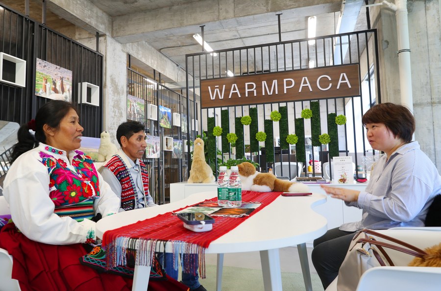 Ma Yuxia (R) talks with Peruvian craftsmen Mamani and his wife Gloria at a warehouse of Warmpaca in east China's Shanghai, Nov. 2, 2023. (Xinhua/Fang Zhe)
