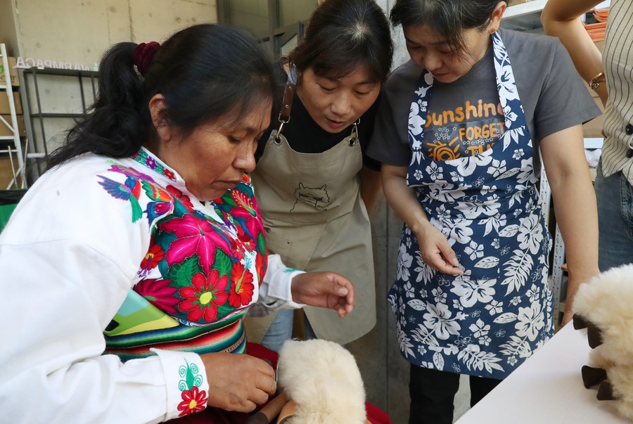Gloria, wife of Peruvian craftsman Mamani, demonstrates the repair of alpaca-fur stuffed toys at a warehouse of Warmpaca in east China's Shanghai, Nov. 2, 2023. (Xinhua/Fang Zhe)