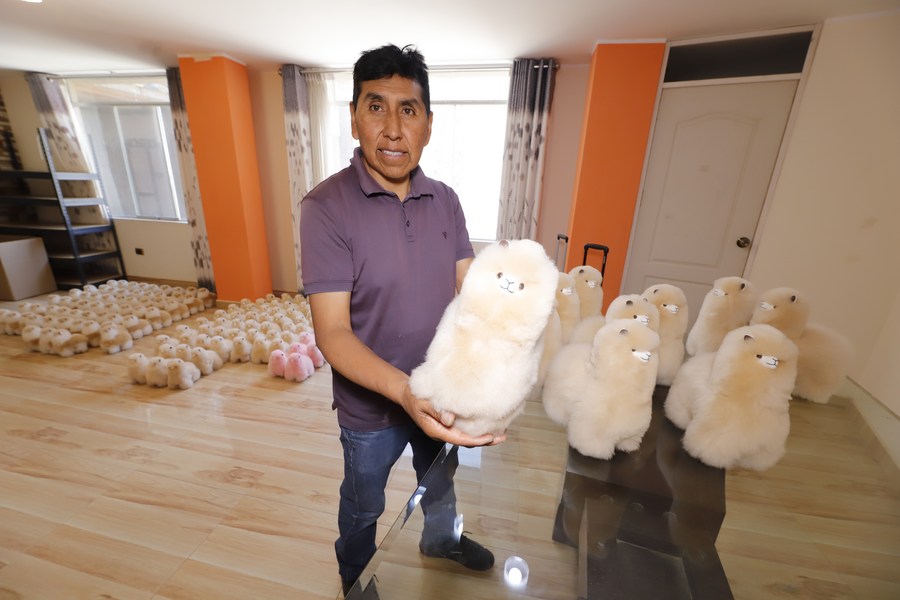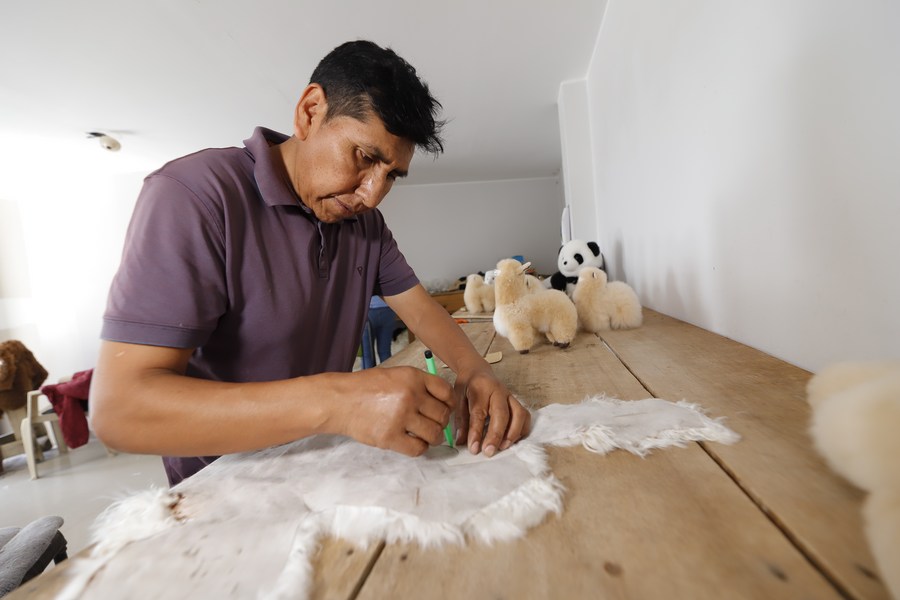 Peruvian craftsman Mamani makes alpaca handicrafts at a workshop in Arequipa, Peru, Oct. 27, 2023. (Photo by Fredy Salcedo/Xinhua)