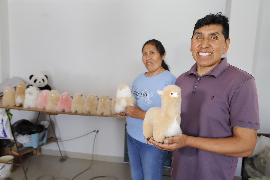 Peruvian craftsmen Mamani (R) and his wife Gloria display alpaca-fur stuffed toys at a workshop in Arequipa, Peru, Oct. 27, 2023. (Photo by Fredy Salcedo/Xinhua)