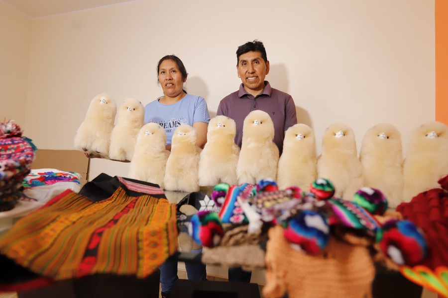 Peruvian craftsmen Mamani (R) and his wife Gloria display alpaca-fur stuffed toys and other Peruvian handicrafts at a workshop in Arequipa, Peru, Oct. 27, 2023. (Photo by Fredy Salcedo/Xinhua)
