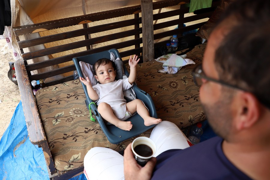 A Palestinian child is seen in a temporary shelter in the southern Gaza Strip city of Khan Younis, Oct. 27, 2023. (Photo by Rizek Abdeljawad/Xinhua)