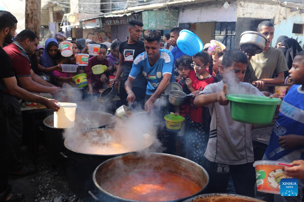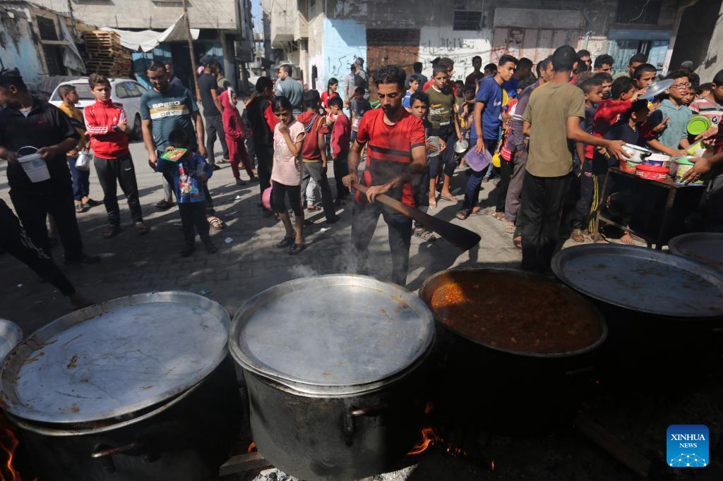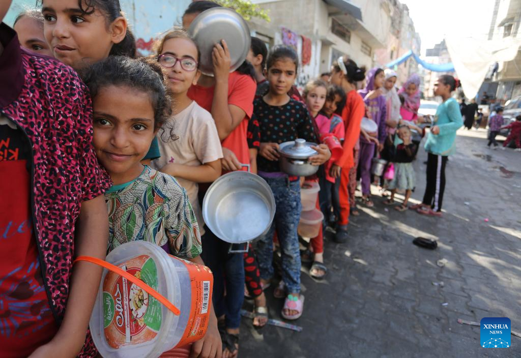 Palestinians queue to receive food at a makeshift charity kitchen in the southern Gaza Strip city of Rafah, Nov. 9, 2023. On Wednesday, Gaza-based health ministry said the Israeli strikes on Gaza has killed at least 10,569 Palestinians, including 4,324 children. Meanwhile, nearly 1.5 million Palestinians are internally displaced in the besieged enclave. (Photo by Khaled Omar/Xinhua)
