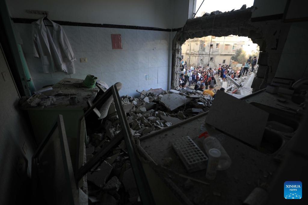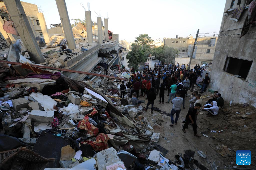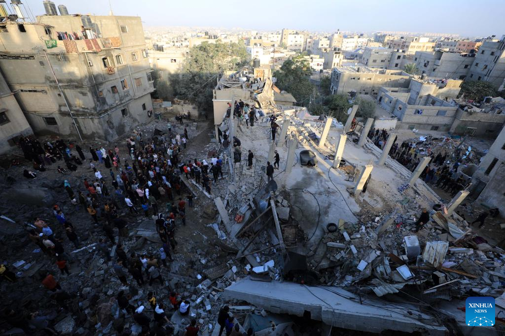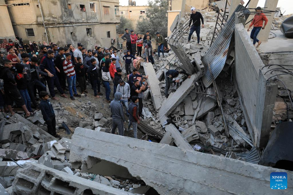 People conduct rescue work among residential buildings destroyed in an Israeli strike in the southern Gaza Strip city of Khan Younis, Nov. 9, 2023. On Wednesday, Gaza-based health ministry said the Israeli strikes on Gaza has killed at least 10,569 Palestinians, including 4,324 children. Meanwhile, nearly 1.5 million Palestinians are internally displaced in the besieged enclave. (Photo by Yasser Qudih/Xinhua)