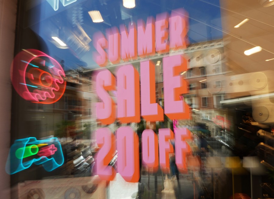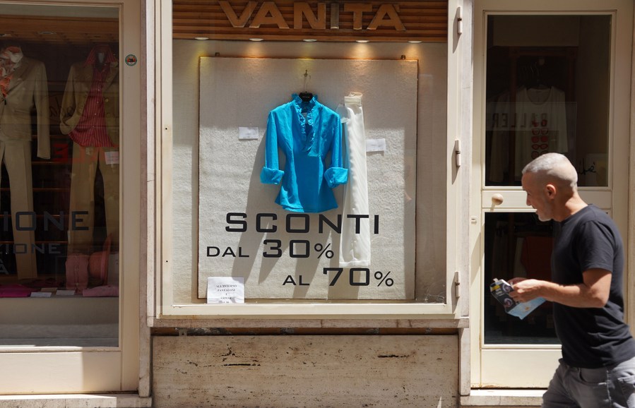 A discount sign is seen on the window of a store in Rome, Italy, on July 6, 2023. (Xinhua/Jin Mamengni)