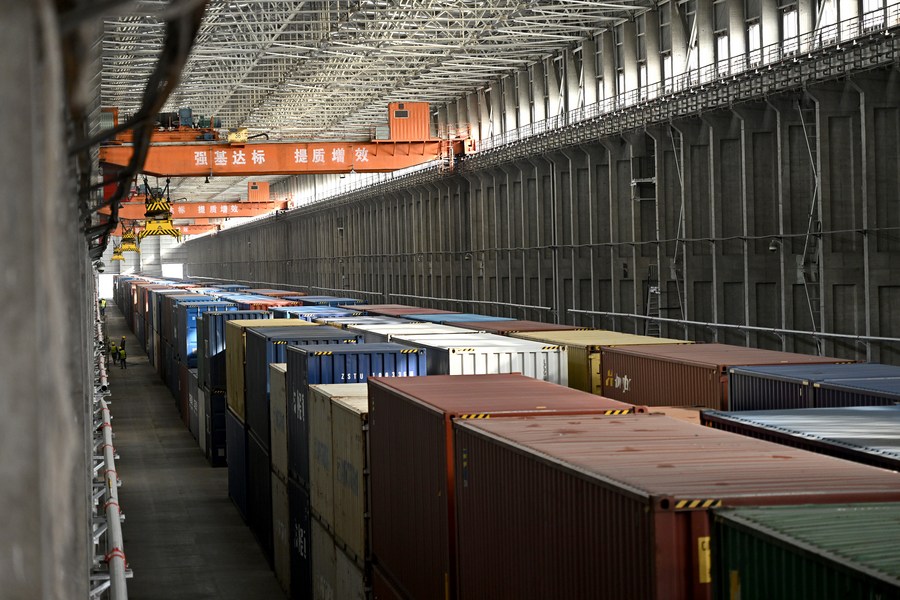 This photo taken on Nov. 4, 2023 shows a container warehouse at the Alataw Pass in northwest China's Xinjiang Uygur Autonomous Region. (Xinhua/Li Xin)