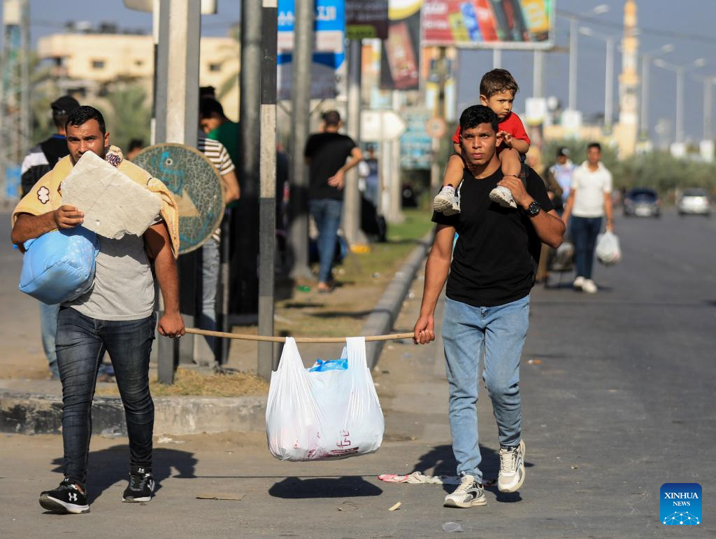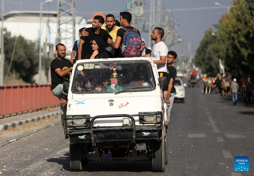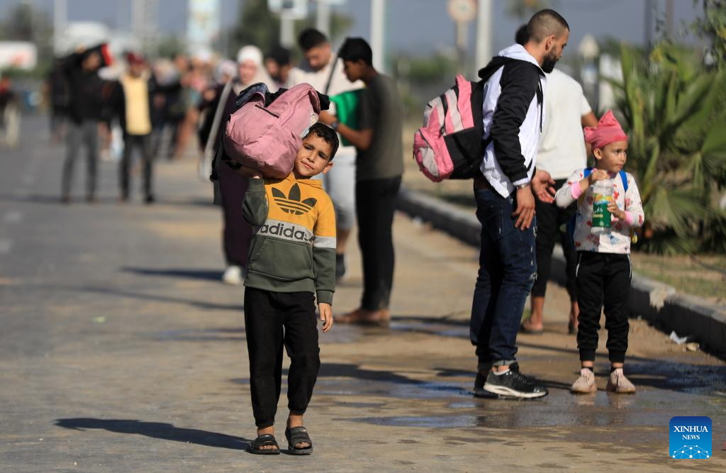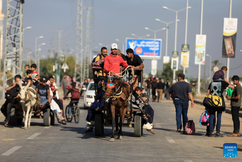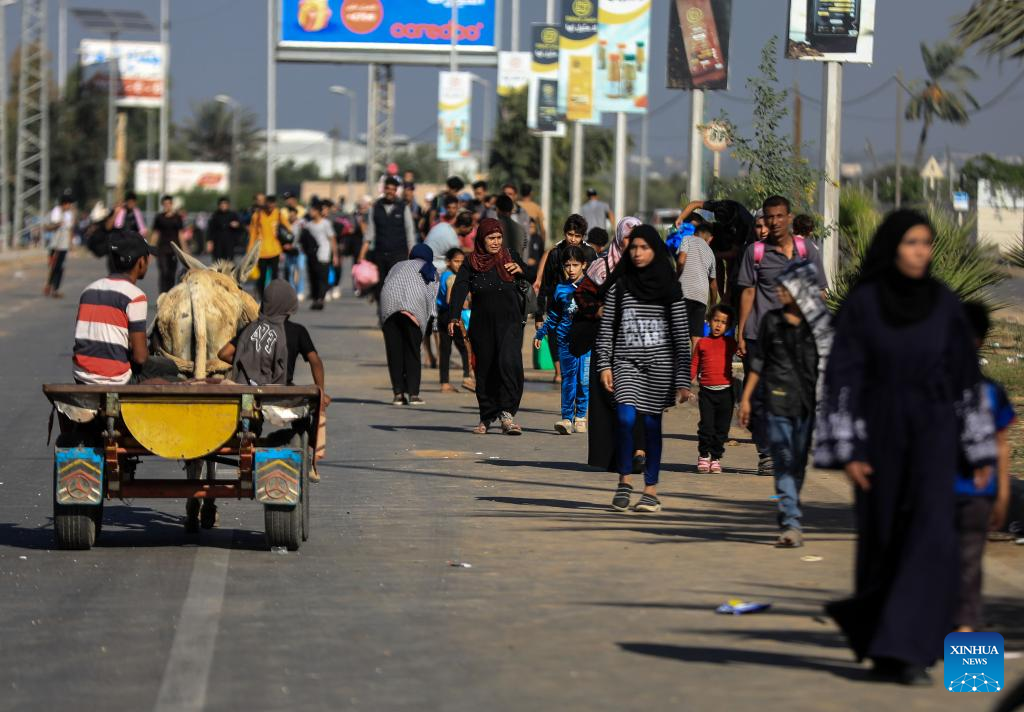 Palestinian people are seen on their way from northern Gaza Strip toward south, in the central Gaza Strip, on Nov. 7, 2023. Over the past month since the outbreak of the deadly conflict, the death toll of Palestinians in Gaza has climbed to 10,328, including 4,237 children, 2,719 women, and 631 elderly people, while deaths of Israelis were over 1,400 with thousands injured, according to official statistics from both sides. (Photo by Yasser Qudih/Xinhua)