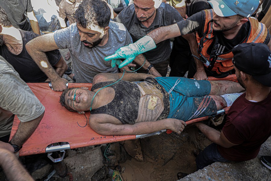 People transfer an injured man from a residential building destroyed in an Israeli strike in the southern Gaza Strip city of Khan Younis, on Nov. 6, 2023. (Photo by Rizek Abdeljawad/Xinhua)