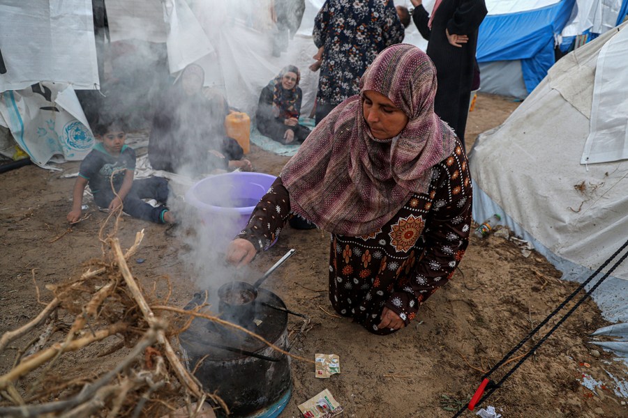 A Palestinian woman cooks at a camp affiliated with the United Nations Relief and Works Agency for Palestine Refugees in the Near East (UNRWA) in the southern Gaza Strip city of Khan Younis, on Nov. 1, 2023. The latest figures released by UNRWA, which has around 13,000 staff working in Gaza, put the extent of the humanitarian crisis into stark relief. The agency said 670,000 internally displaced people are sheltering in 150 UNRWA installations. (Photo by Rizek Abdeljawad/Xinhua)