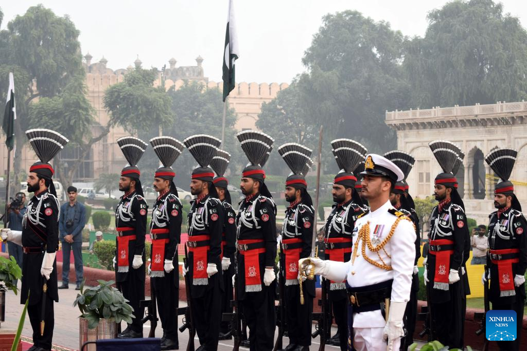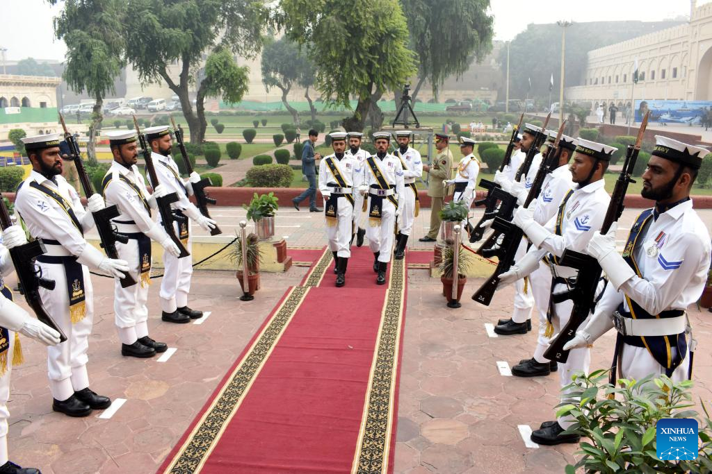 Pakistani servicemen attend a remembrance ceremony marking the 146th birthday anniversary of national poet Muhammad Iqbal at the mausoleum of Muhammad Iqbal in Lahore, Pakistan on Nov. 9, 2023. Pakistan on Thursday celebrated the 146th birthday anniversary of its national poet, Muhammad Iqbal, with national fervor. (Photo by Sajjad/Xinhua)
