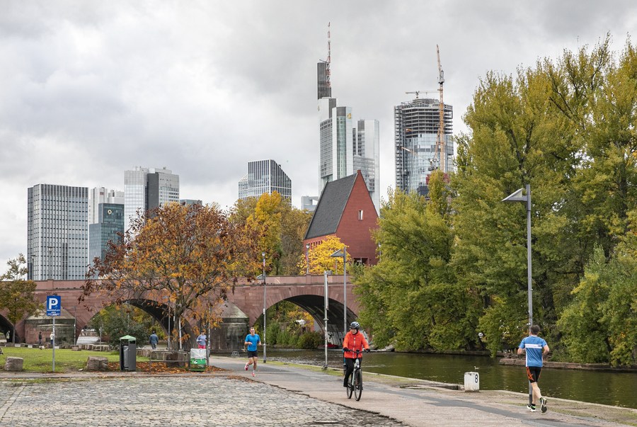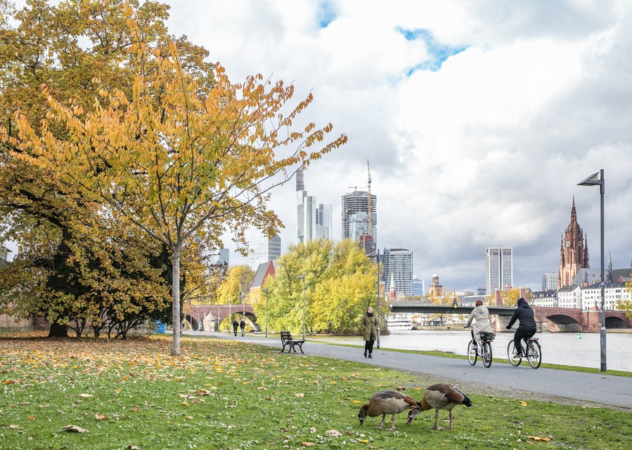 This photo taken on Nov. 8, 2023 shows autumn scenery along the river Main in Frankfurt, Germany. (Xinhua/Zhang Fan)