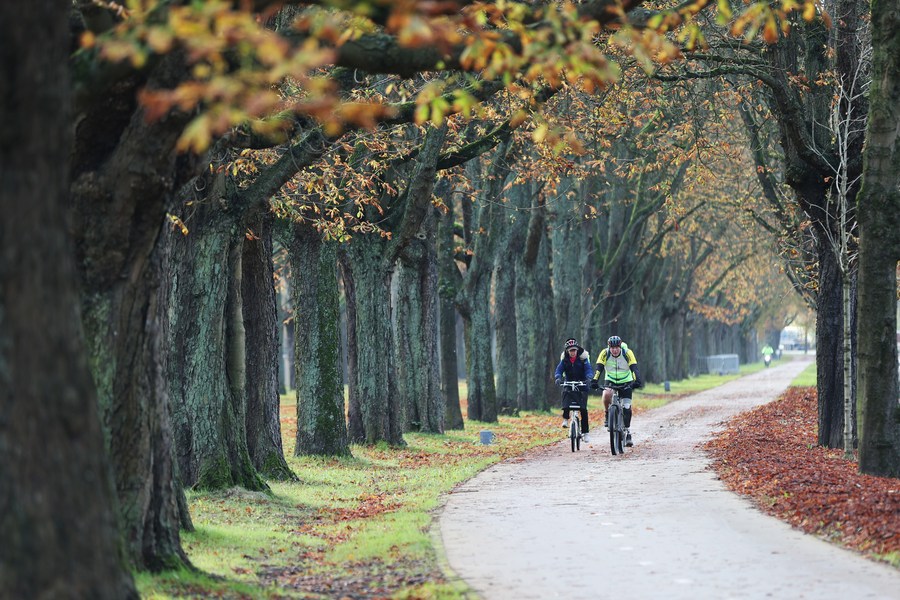 People ride bicycles at a park in Brussels, Belgium, Nov. 7, 2023. (Xinhua/Zhao Dingzhe)