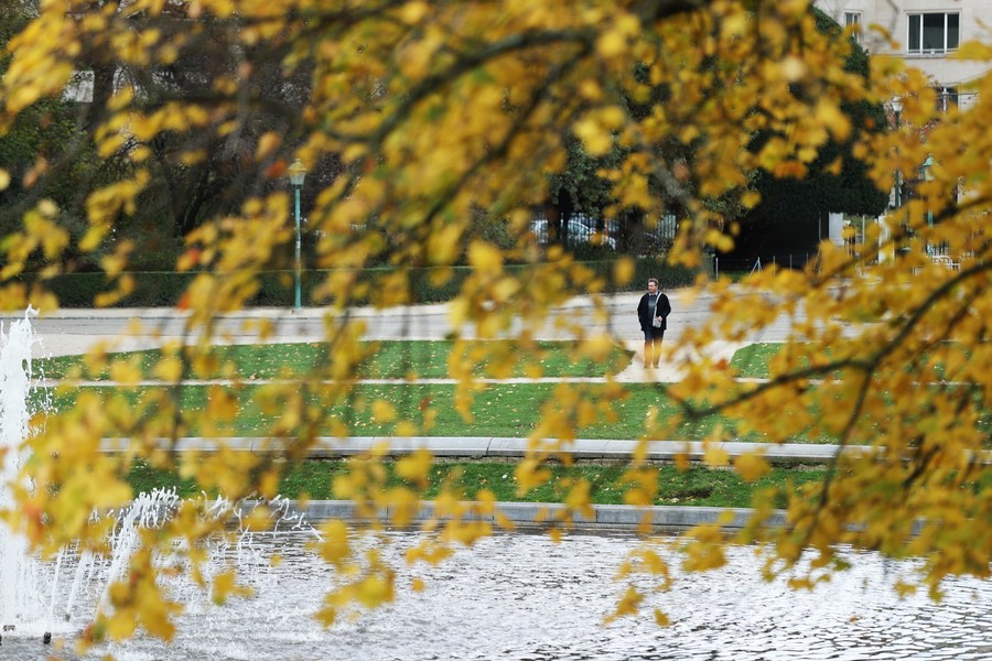 A man enjoys the autumn scenery at a park in Brussels, Belgium, Nov. 7, 2023. (Xinhua/Zhao Dingzhe)