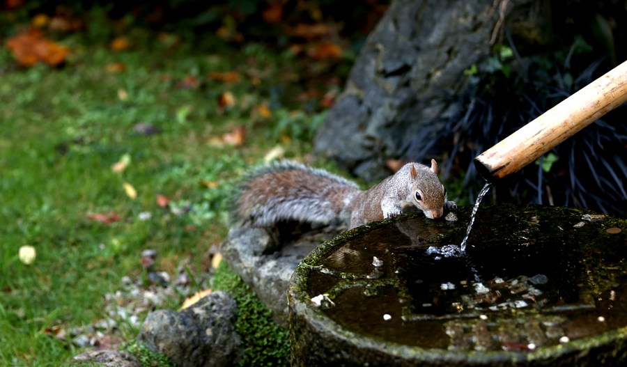 A squirrel drinks water at Holland Park in London, Britain, Nov. 5, 2023. (Xinhua/Li Ying)