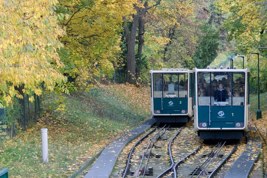 This photo taken on Nov. 1, 2023 shows two funicular cars on the Petrin hill in Prague, the Czech Republic. (Xinhua/Deng Yaomin)