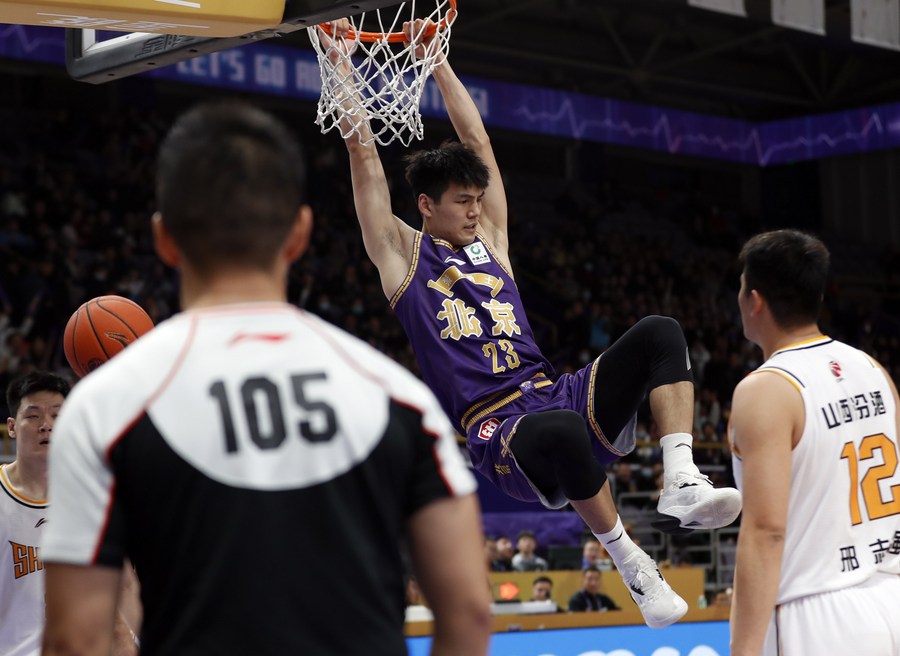 Chen Guohao (2nd R) of the Beijing Royal Fighters dunks in the seventh round of the Chinese Basketball Association (CBA League) against the Shanxi Loongs on November 6, 2023. (Xinhua/Luo Yuan)