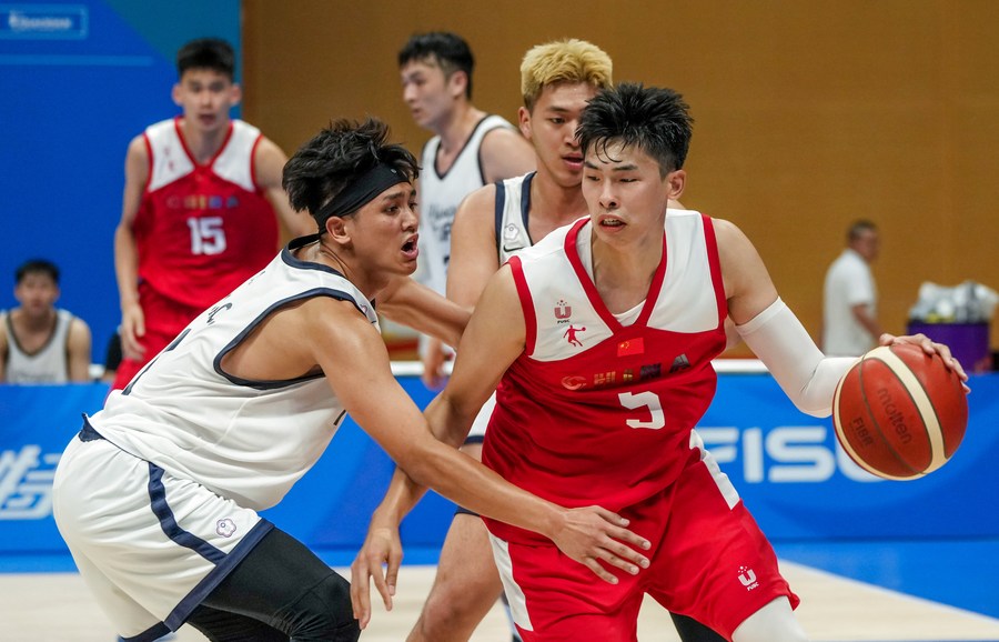 Zou Yang (R) of China controls the ball during the basketball men's preliminary round group A match between China and Chinese Taipei at the 31st FISU Summer World University Games in Chengdu, southwest China's Sichuan Province, July 31, 2023. (Xinhua/Hu Chao)