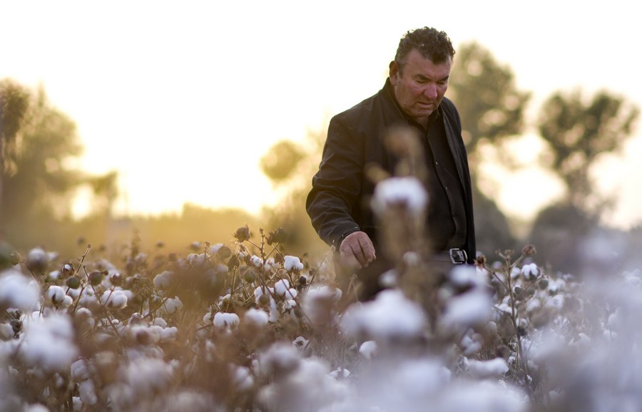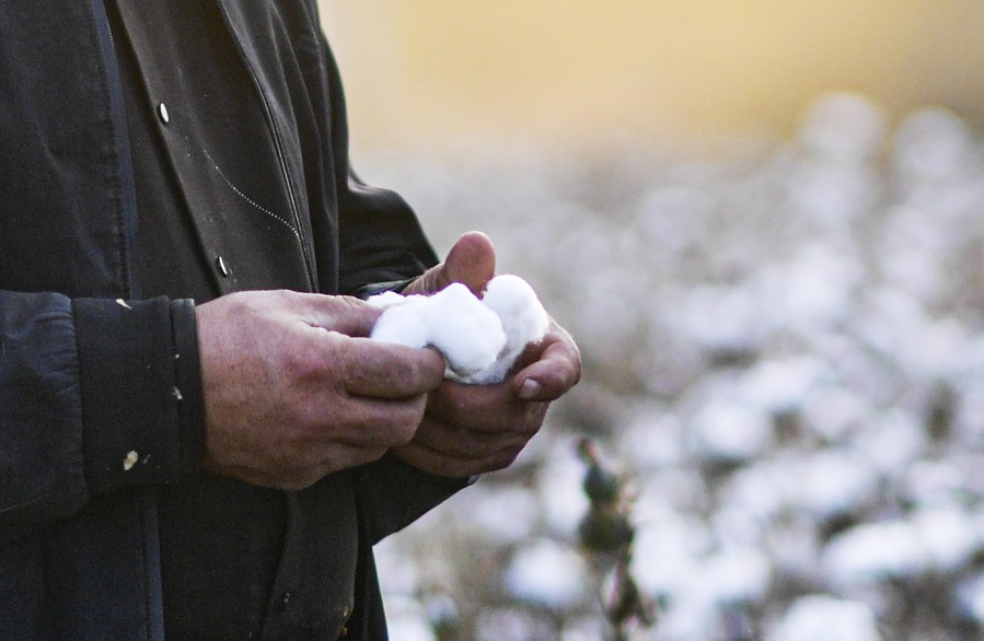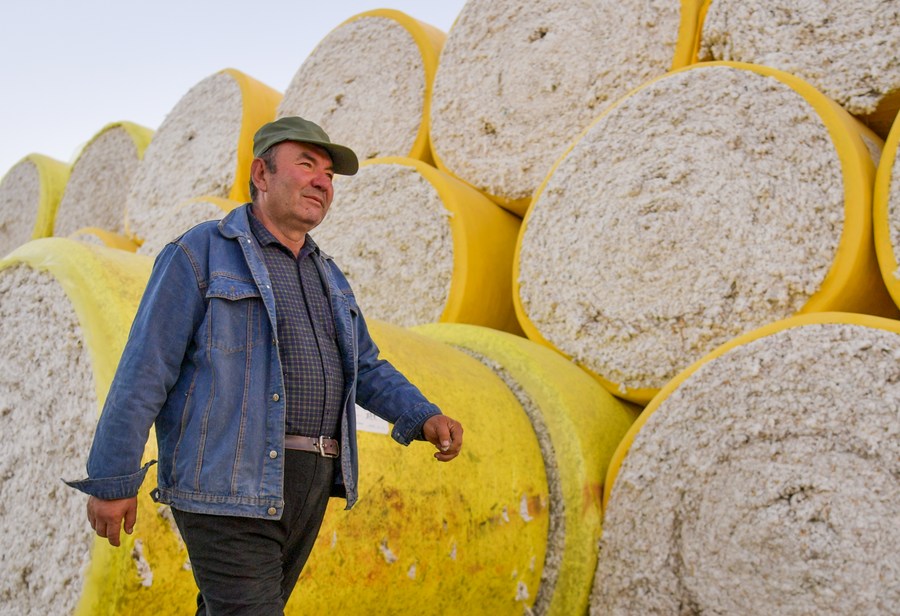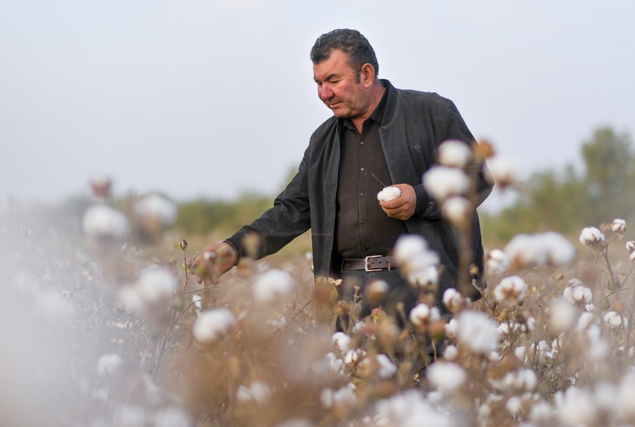 Arkin Reyim checks cotton in Bax Mali Village of Yuli County, northwest China's Xinjiang Uygur Autonomous Region, Oct. 20, 2023. (Xinhua/Wang Fei)■