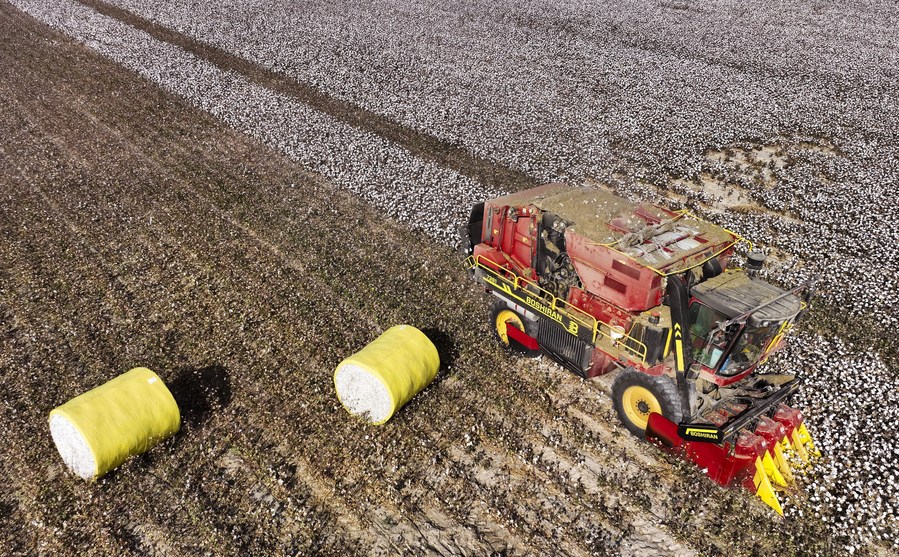 This aerial photo shows a cotton-picking machine packing cotton in a field in Bax Mali Village of Yuli County, northwest China's Xinjiang Uygur Autonomous Region, Oct. 20, 2023. (Xinhua/Wang Fei)