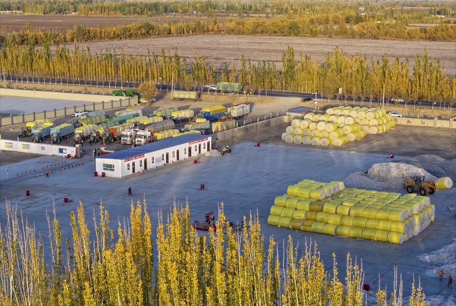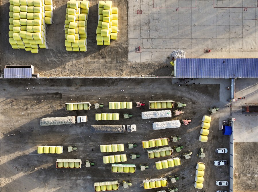 This aerial photo taken on Nov. 1, 2023 shows packed cotton at a processing plant in Yuli County, northwest China's Xinjiang Uygur Autonomous Region. (Xinhua/Wang Fei)