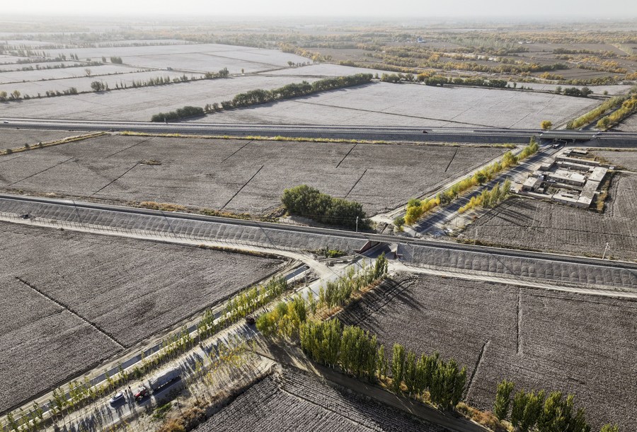 This aerial photo shows cotton fields in Yuli County, northwest China's Xinjiang Uygur Autonomous Region, Nov. 2, 2023. (Xinhua/Wang Fei)