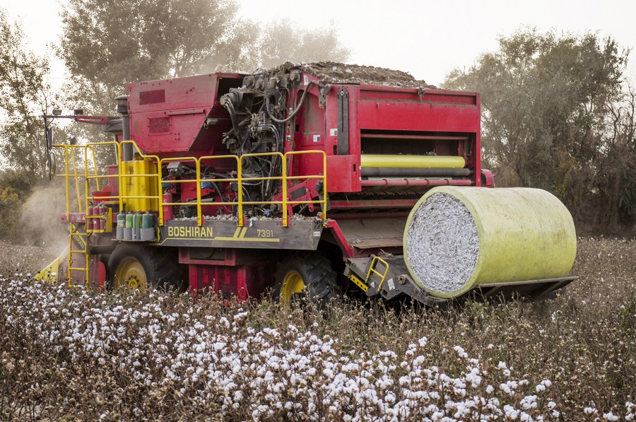 This is the busiest time of the year for Arkin Reyim. A cotton-picking machine operates in over 300 mu (20 hectares) of cotton fields and automatically bundles cotton into rolls, each weighing about 2 tons.