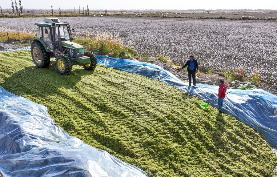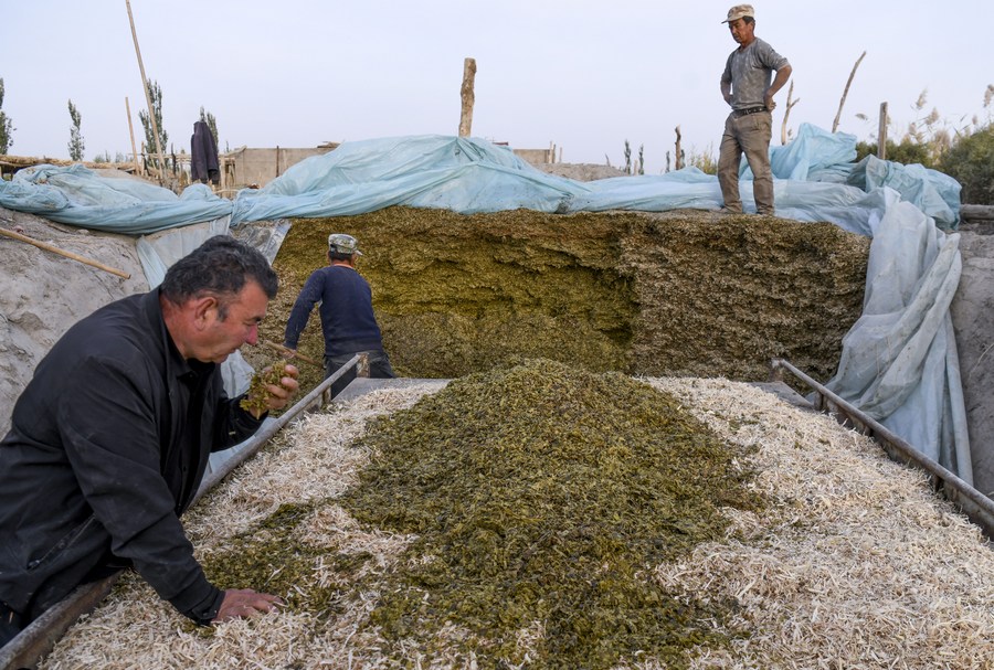 Arkin Reyim checks fodder in Bax Mali Village of Yuli County, northwest China's Xinjiang Uygur Autonomous Region, Oct. 19, 2023. (Xinhua/Wang Fei)