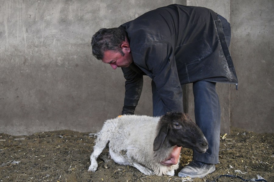 Arkin Reyim checks his sheep in Bax Mali Village of Yuli County, northwest China's Xinjiang Uygur Autonomous Region, Oct. 19, 2023. (Xinhua/Wang Fei)