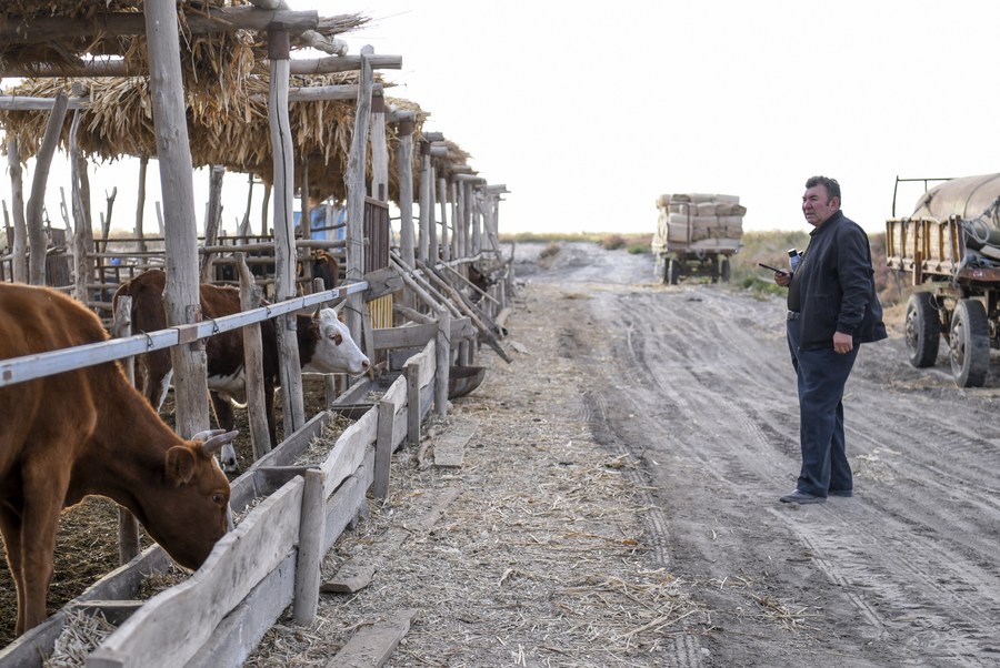 Arkin Reyim checks his cows in Bax Mali Village of Yuli County, northwest China's Xinjiang Uygur Autonomous Region, Oct. 19, 2023. (Xinhua/Wang Fei)