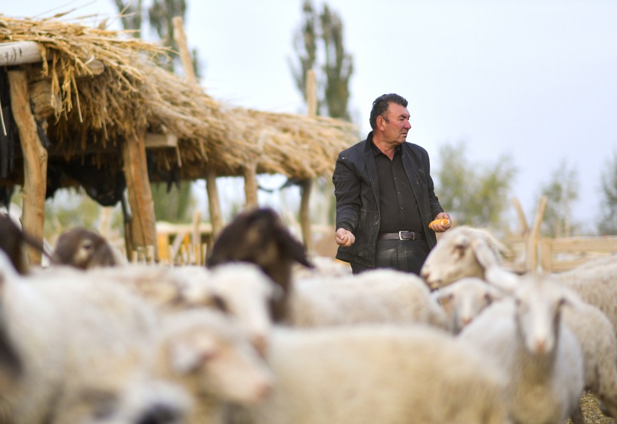 Arkin Reyim feeds his sheep in Bax Mali Village of Yuli County, northwest China's Xinjiang Uygur Autonomous Region, Oct. 19, 2023. (Xinhua/Wang Fei)
