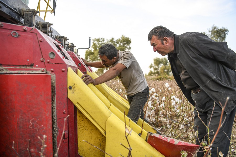 Arkin Reyim checks a cotton-picking machine in his field in Bax Mali Village of Yuli County, northwest China's Xinjiang Uygur Autonomous Region, Oct. 20, 2023. (Xinhua/Wang Fei)