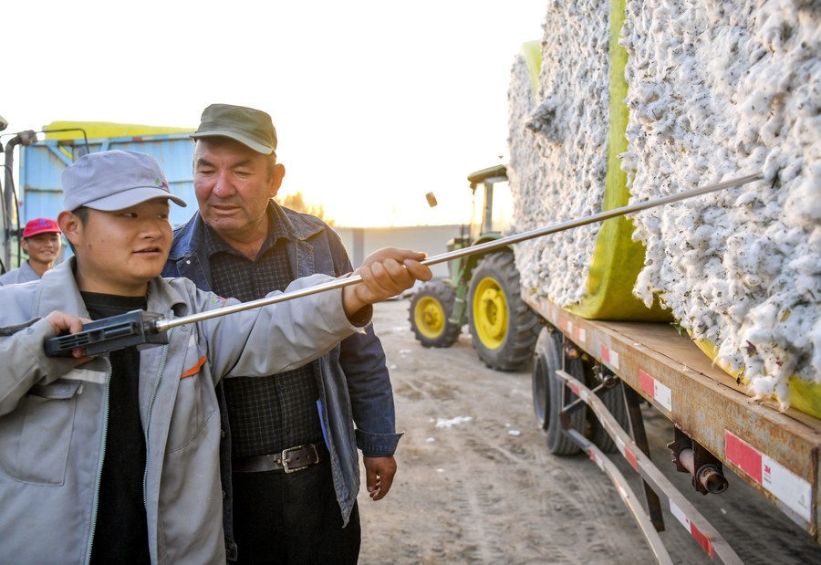 Arkin Reyim looks on as a worker checks the humidity of his cotton outside a processing plant in Yuli County, northwest China's Xinjiang Uygur Autonomous Region, Nov. 1, 2023. (Xinhua/Wang Fei)