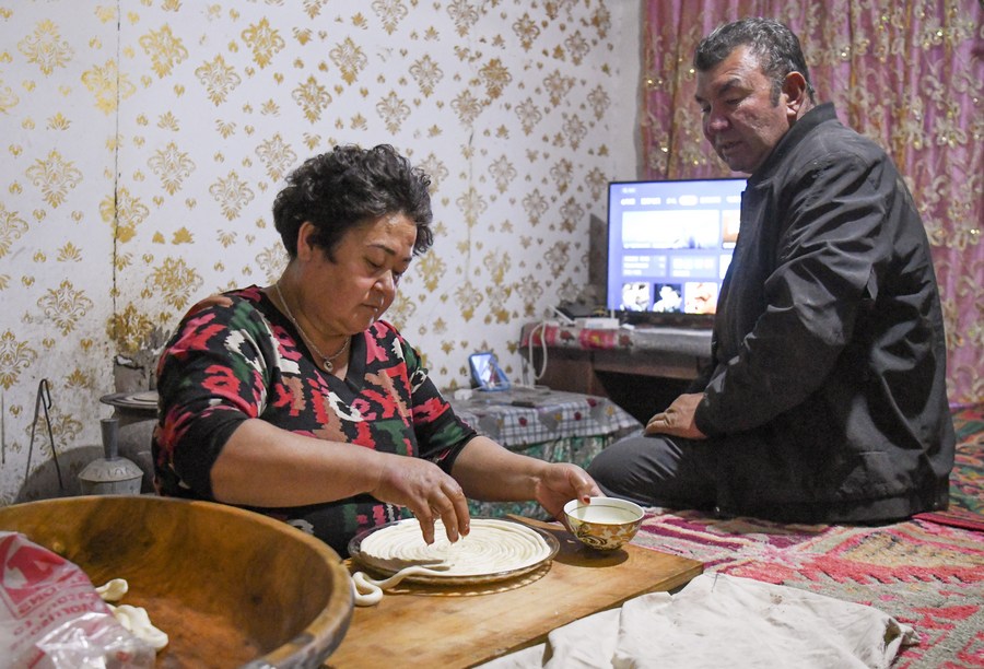 Arkin Reyim talks with his wife at home in Bax Mali Village of Yuli County, northwest China's Xinjiang Uygur Autonomous Region, Oct. 20, 2023. (Xinhua/Wang Fei)