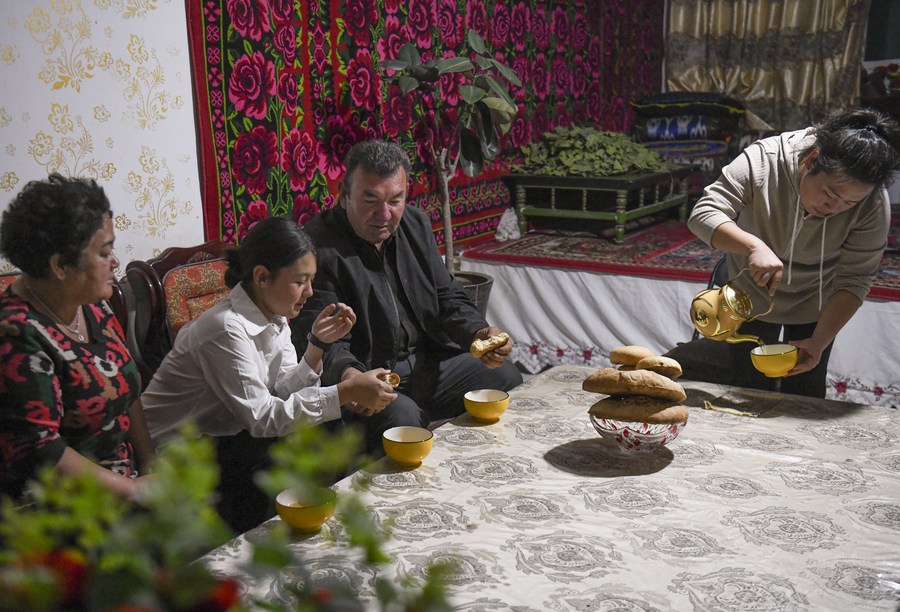 Arkin Reyim has dinner with his family members at home in Bax Mali Village of Yuli County, northwest China's Xinjiang Uygur Autonomous Region, Oct. 20, 2023. (Xinhua/Wang Fei)