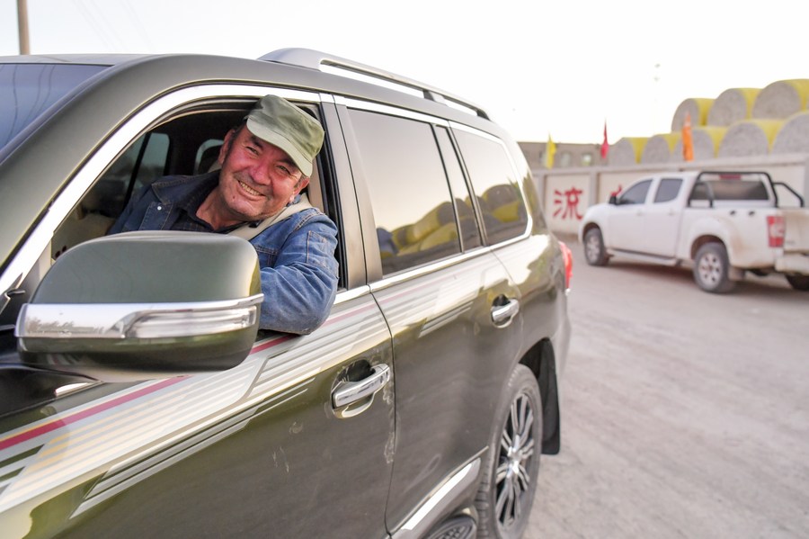 Arkin Reyim smiles before he leaves a cotton processing plant by car in Yuli County, northwest China's Xinjiang Uygur Autonomous Region, Nov. 1, 2023. (Xinhua/Wang Fei)