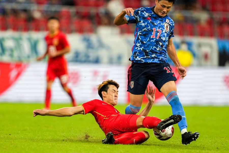 Xu Haofeng (L) of China defends against Miyaichi Ryo of Japan during a 2022 EAFF (East Asian Football Federation) E-1 Football Championship match at Toyota Stadium in Toyota City in Aichi prefecture, Japan, July 24, 2022. (Xinhua/Zhang Xiaoyu)
