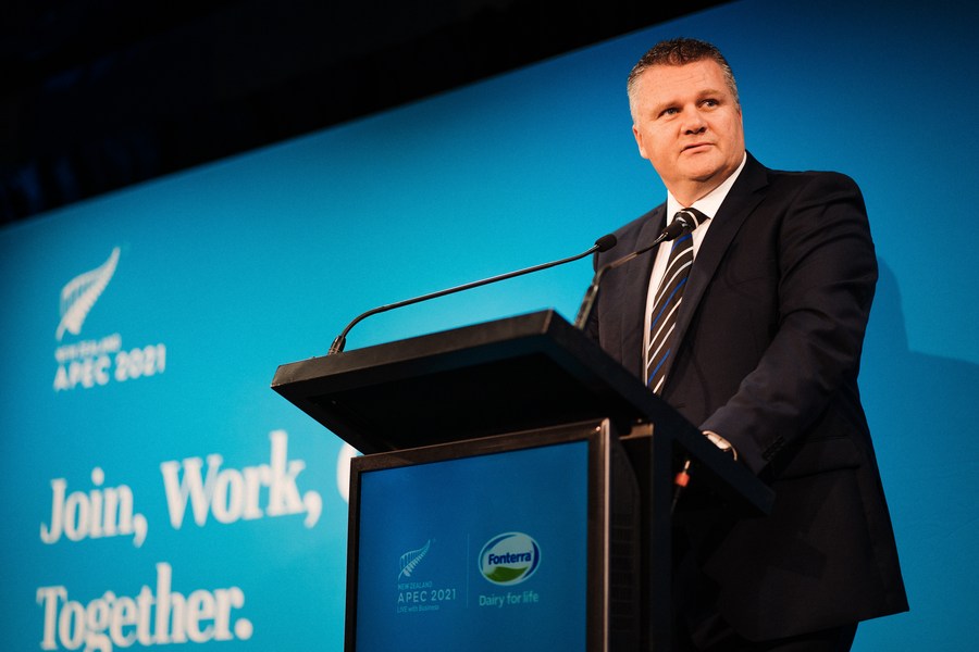 Fonterra chief executive Miles Hurrell speaks at APEC (Asia-Pacific Economic Cooperation) 2021 LIVE with Business: A sustainable and resilient APEC food system, an APEC event held in Auckland, New Zealand, Aug. 5, 2021. (Xinhua)