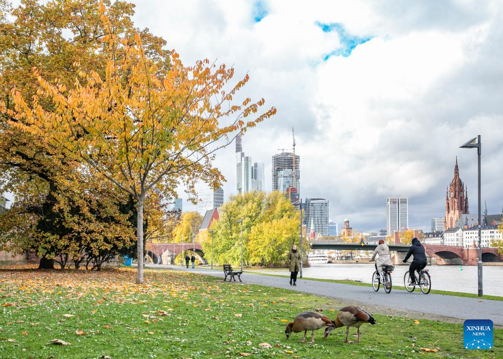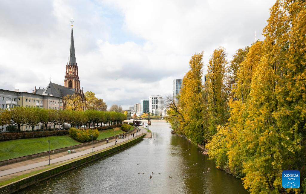 This photo taken on Nov. 8, 2023 shows autumn scenery along the river Main in Frankfurt, Germany. (Xinhua/Zhang Fan)