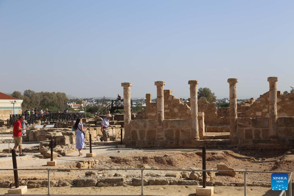 People visit Paphos Archaeological Park in Paphos, Cyprus, Nov. 8, 2023. Paphos Archaeological Park is a famous archaeological site in Cyprus and has been included in the UNESCO World Heritage Sites list since 1980. (Xinhua/Guo Mingfang)