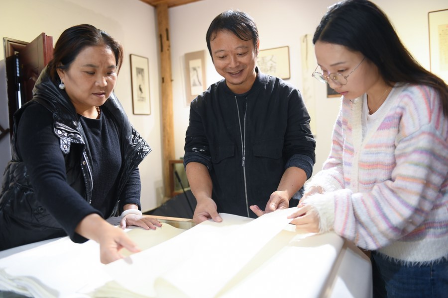Huang Hongjian (C) and his wife Lai Lifang (L) show a visitor different types of paper they made at Huang's studio in Kaihua County of Quzhou, east China's Zhejiang Province, Nov. 9, 2023. (Xinhua/Weng Xinyang)